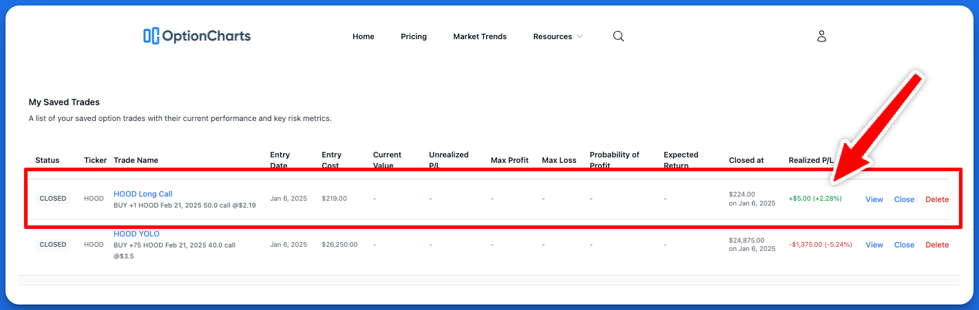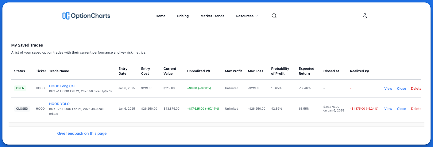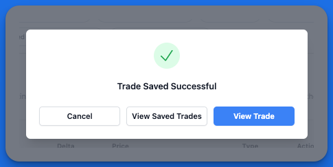 This option takes us to a dedicated page where we can view all of our Saved Trades at once in a table. Here we're able to view key trade metrics during the lifetime of the trade to better inform our future trading decisions such as gain/loss, max profit, max loss, and probability of profit.
