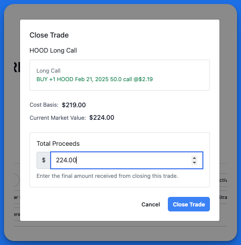 Not only can you track the performance of the strategy, but you can track your specific performance too. Track profitability and more by "Closing" your saved trade.